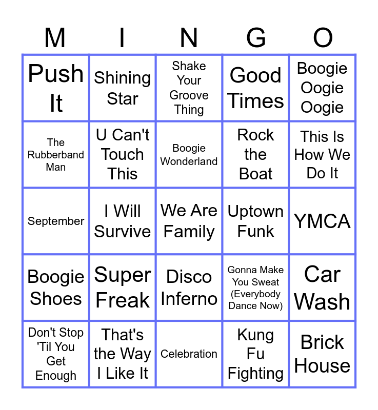 This bingo card has 30 words: That's the Way I Like It, Play that Funky Music, I Will Survive, You Should Be Dancin', Push It, Shake Your Groove Thing, U Can't Touch This, Disco Inferno, Uptown Funk, Celebration, YMCA, We Are Family, Kung Fu Fighting, Brick House, This Is How We Do It, Beat It, Gonna Make You Sweat (Everybody Dance Now), Boogie Shoes, Super Freak, Boogie Oogie Oogie, September, Ice Ice Baby, Shining Star, Rock the Boat, The Rubberband Man, Good Times, Car Wash, Don't Stop 'Til You Get Enough, Boogie Wonderland and Get Down Tonight.