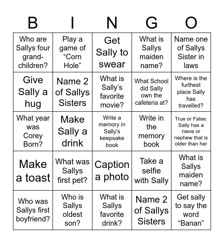 This bingo card has a free space and 57 words: What High School did Sally attend?, Who was Sallys first boyfriend?, What year did Sally get married?, Who are Sallys four grand-children?, What is Sallys favorite drink?, Where was Sally Born?, Name 2 of Sallys Sisters, Who are Sallys 4 brothers, What School did Sally own the cafeteria at?, What is Sallys full name?, What is Sallys maiden name?, Where did Sally grow up?, What is Sallys mom's name?, What is Sallys dads name?, What is Sallys favorite thing to do at the Casino?, Name one of Sallys Brother in laws, Name one of Sallys Sister in laws, Make Sally a drink, Teach Sally a new handshake, Get sally to say the word “Banan”, Write in the memory book, Make Sally laugh, Take a selfie with Sally, Get Sally to swear, Where was Sally’s first place on her own?, What is Sally’s favorite movie?, Who was Sally’s first kiss?, What Bank did Sally work at?, Where is the furthest place Sally has travelled?, True or False: Sally likes to rearrange furniture, True or False: Sally has been to Alaska, True or False: Sally once farted when she thought no one was listening, True or False: Sally likes to play Euchre, True or False: Sally has 3 sons, True or False: Sally has a niece or nephew that is older than her, Give Sally a hug, Do a little dance for Sally, What year was Corey Born?, What year was Greg born?, Make a toast, Play a game of “Corn Hole”, Caption a photo, Sing happy birthday to Sally, Get a group of people to sing “Sweet Caroline”, Get Sally to swear, Where was Sallys first house with Ron?, What was Sallys first pet?, Who is Sallys oldest son?, How many times has Sally been to Carribean?, Who is Sallys oldest sibling?, What High School did Sally attend?, Name 2 of Sallys Sisters, Who are Sallys 4 brothers, What School did Sally own the cafeteria at?, What is Sallys full name?, What is Sallys maiden name? and Where did Sally grow up?.