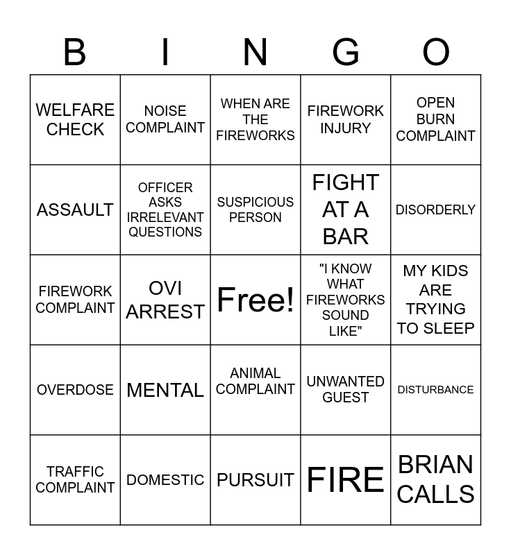 This bingo card has a free space and 24 words: MENTAL, DOMESTIC, SUSPICIOUS PERSON, TRAFFIC COMPLAINT, OPEN BURN COMPLAINT, WELFARE CHECK, ASSAULT, NOISE COMPLAINT, "I KNOW WHAT FIREWORKS SOUND LIKE", ANIMAL COMPLAINT, FIGHT AT A BAR, FIREWORK COMPLAINT, UNWANTED GUEST, DISTURBANCE, OFFICER ASKS IRRELEVANT QUESTIONS, FIRE, MY KIDS ARE TRYING TO SLEEP, WHEN ARE THE FIREWORKS, DISORDERLY, OVI ARREST, BRIAN CALLS, OVERDOSE, FIREWORK INJURY and PURSUIT.