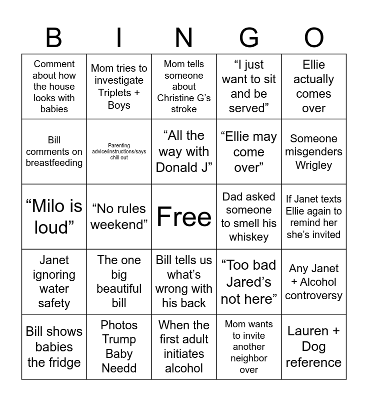 This bingo card has a free space and 24 words: The one big beautiful bill, Photos Trump Baby Needd, “All the way with Donald J”, Bill shows babies the fridge, Ellie actually comes over, Comment about how the house looks with babies, Bill comments on breastfeeding, Mom tries to investigate Triplets + Boys, Dad asked someone to smell his whiskey, Bill tells us what’s wrong with his back, “Ellie may come over”, “Milo is loud”, “Too bad Jared’s not here”, Any Janet + Alcohol controversy, Parenting advice/instructions/says chill out, Mom wants to invite another neighbor over, If Janet texts Ellie again to remind her she’s invited, Mom tells someone about Christine G’s stroke, Someone misgenders Wrigley, “No rules weekend”, Lauren + Dog reference, Janet ignoring water safety, “I just want to sit and be served” and When the first adult initiates alcohol.