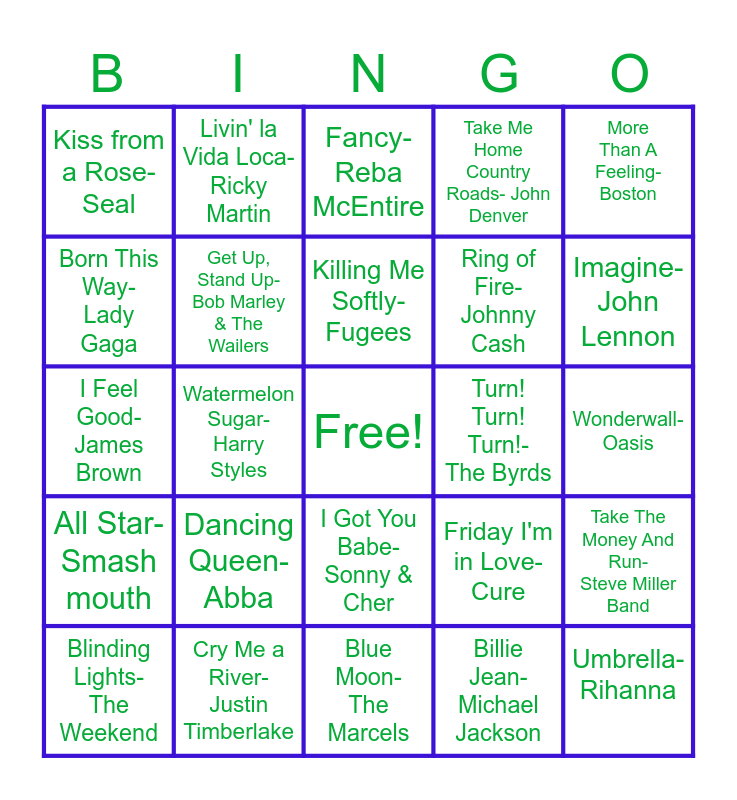 This bingo card has a free space and 79 words: Happy- Pharrell Williams, Sittin' On the Dock of the Bay- Otis Redding, Fancy- Reba McEntire, Come On Eileen- Dexys Midnight Runners, My Girl- Temptations, Fly Me To The Moon- Frank Sinatra, Summertime Blues- Brian Setzer, Rocket Man- Elton John, Hit The Road Jack- Ray Charles, Don't Speak- No Doubt, Should I Stay or Should I Go- The Clash, Ordinary- Alex Warren, Take Me Home Country Roads- John Denver, More Than A Feeling- Boston, Take on Me- a-ha, Get Up, Stand Up- Bob Marley & The Wailers, Sultans of Swing- Dire Straits, Turn! Turn! Turn!- The Byrds, Livin' On A Prayer- Bon Jovi, I Feel Good- James Brown, Stayin Alive- Bee Gees, Killing Me Softly- Fugees, Ring of Fire- Johnny Cash, Imagine- John Lennon, Kiss from a Rose- Seal, Despacito- Luis Fonsi, Daddy Yankee, Birds of a Feather- Billie Eilish, Pretty Woman- Roy Orbinson, Brown Eyed Girl- Van Morrison, Drift Away- Dobie Gray, Dancing Queen- Abba, What's Going On- Marvin Gaye, Billie Jean- Michael Jackson, Wonderwall- Oasis, You're Still The One- Shania Twain, Cry Me a River- Justin Timberlake, La Bamba- Ritchie Valens, Celebration- Kool & The Gang, Take The Money And Run- Steve Miller Band, Born This Way- Lady Gaga, Go Your Own Way- Fleetwood Mac, I Want To Hold Your Hand- The Beatles, Respect- Aretha Franklin, I Will Survive- Gloria Gaynor, Guitars, Cadillacs- Dwight Yoakam, Livin' la Vida Loca- Ricky Martin, I Got You Babe- Sonny & Cher, Have You Ever Seen The Rain- Creedence Clearwater, Friends in Low Places- Garth Brooks, Love on Top- Beyonce', Before He Cheats- Carrie Underwood, Blue Moon- The Marcels, Friday I'm in Love- Cure, It's in His Kiss- Betty Everett, Jailhouse Rock- Elvis Presley, Careless Whisper- George Michael, Signed Sealed Delivered- Stevie Wonder, 9-5- Dolly Parton, I Wanna Dance- Whitney Houston, Blinding Lights- The Weekend, Watermelon Sugar- Harry Styles, Sunflower- Post Malone, Swae, Bye Bye Bye- NSYNC, Party in The U.S.A.- Miley Cyrus, Hey Ya!- Outkast, Oops! I did it Again- Britney Spears, Nothin' But A Good Time- Poison, Vogue- Madonna, Zombie- Cranberries, All Star- Smash mouth, Wake Me Up Before You Go Go- Wham, Purple Rain- Prince, The Final Countdown- Europe, Umbrella- Rihanna, Rolling in the Deep- Adele, Hotel California- Eagles, Good Vibrations- Beach Boys, Ice Ice Baby- Vanilla Ice and Uptown Funk- Bruno Mars.