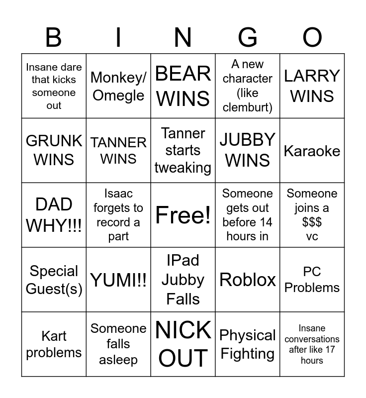 This bingo card has a free space and 24 words: YUMI!!, Someone falls asleep, Tanner starts tweaking, Kart problems, LARRY WINS, Insane dare that kicks someone out, GRUNK WINS, Monkey/ Omegle, Someone gets out before 14 hours in, IPad Jubby Falls, JUBBY WINS, DAD WHY!!!, Roblox, PC Problems, TANNER WINS, Physical Fighting, Someone joins a $$$ vc, BEAR WINS, Karaoke, Isaac forgets to record a part, Insane conversations after like 17 hours, Special Guest(s), A new character (like clemburt) and NICK OUT.