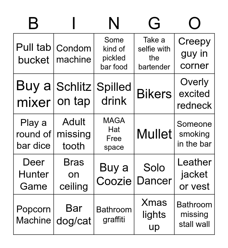 This bingo card has a free space and 29 words: Popcorn Machine, Dollar Bill on wall, Adult missing tooth, Broken clock, Pull tab bucket, Some kind of pickled bar food, Schlitz on tap, Bras on ceiling, Mullet, Bar dog/cat, Someone smoking in the bar, Bathroom missing stall wall, Bathroom graffiti, Xmas lights up, Overly excited redneck, Buy someone a beer, Buy a Coozie, Deer Hunter Game, Creepy guy in corner, Play a round of bar dice, Solo Dancer, Toby Keith or Led Zepplin playing, Bikers, Buy a mixer, Take a selfie with the bartender, Condom machine, Leather jacket or vest, Spilled drink and Carpeted floors.