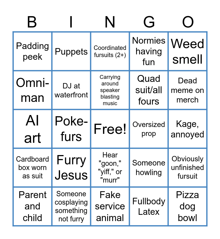 This bingo card has a free space and 24 words: Furry Jesus, Someone cosplaying something not furry, Carrying around speaker blasting music, Parent and child, Weed smell, Padding peek, Omni-man, Puppets, Oversized prop, Hear "goon," "yiff," or "murr", Quad suit/all fours, AI art, Someone howling, Obviously unfinished fursuit, DJ at waterfront, Fullbody Latex, Kage, annoyed, Coordinated fursuits (2+), Dead meme on merch, Poke-furs, Pizza dog bowl, Cardboard box worn as suit, Normies having fun and Fake service animal.