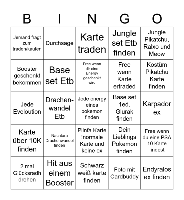 This bingo card has a free space and 24 words: Nachtara Drachenwandel finden, Hit aus einem Booster, Free wenn dir eine Energy geschenkt wird, 2 mal Glücksradh drehen, Jungle Pikatchu, Ralxo und Meow, Jemand fragt zum traden/kaufen, Booster geschenkt bekommen, Durchsage, Base set 1ed. Glurak finden, Plinfa Karte !normale Karte und keine ex, Free wenn Karte ertraded, Jede Eveloution, Dein Lieblings Pokemon finden, Free wenn du eine PSA 10 Karte findest, Base set Etb, Foto mit Cardbuddy, Karpador ex, Karte traden, Kostüm Pikatchu Karte finden, Drachen-wandel Etb, Endyralos ex finden, Karte über 10K finden, Jungle set Etb finden and Schwarz weiß karte finden.