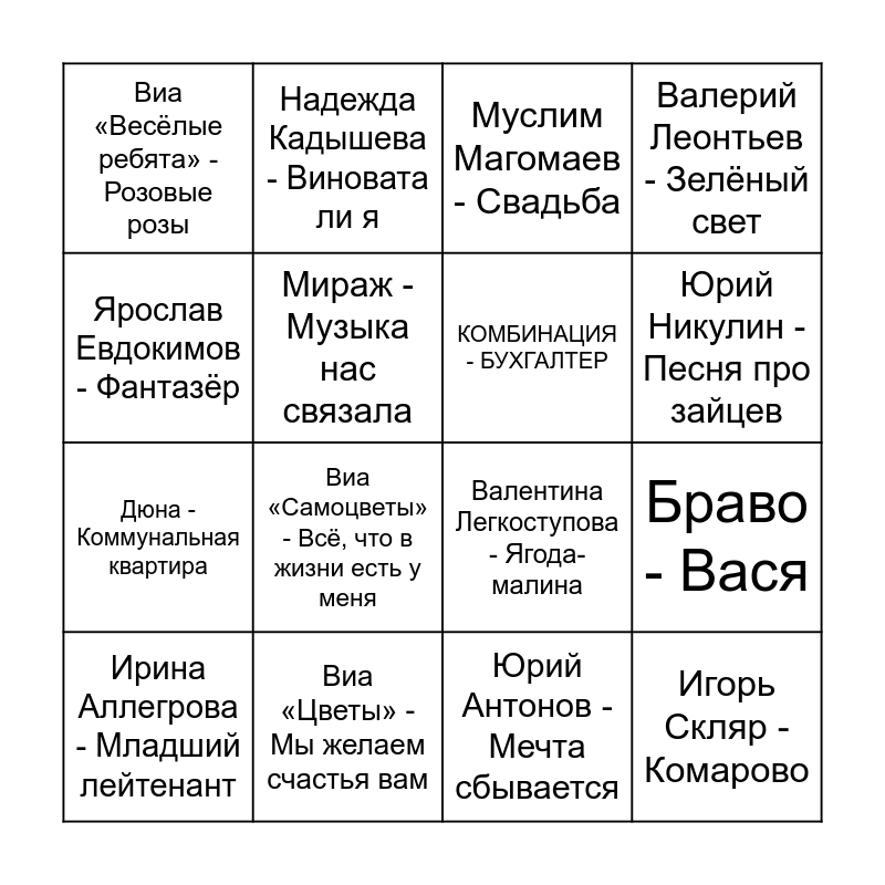 This bingo card has 24 words: Эдита Пьеха - Наш сосед, Земляне - Трава у дома, Юрий Никулин - Песня про зайцев, Игорь Корнелюк - Билет на балет, Ярослав Евдокимов - Фантазёр, Виа «Весёлые ребята» - Розовые розы, Мираж - Музыка нас связала, Надежда Кадышева - Виновата ли я, Виа «Цветы» - Мы желаем счастья вам, ЭДУАРД ХИЛЬ - ТРОЛОЛО, Дюна - Коммунальная квартира, Валентина Легкоступова - Ягода-малина, Виа «Синяя птица» - Там, где клён шумит, Ольга Зарубина - На теплоходе музыка играет, КОМБИНАЦИЯ - БУХГАЛТЕР, ЛЕВ ЛЕЩЕНКО - ПРОЩАЙ, Юрий Антонов - Мечта сбывается, Муслим Магомаев - Свадьба, Виа «Самоцветы» - Всё, что в жизни есть у меня, Браво - Вася, Ирина Аллегрова - Младший лейтенант, Игорь Скляр - Комарово, Валерий Леонтьев - Зелёный свет and Андрей Миронов - Бабочка.