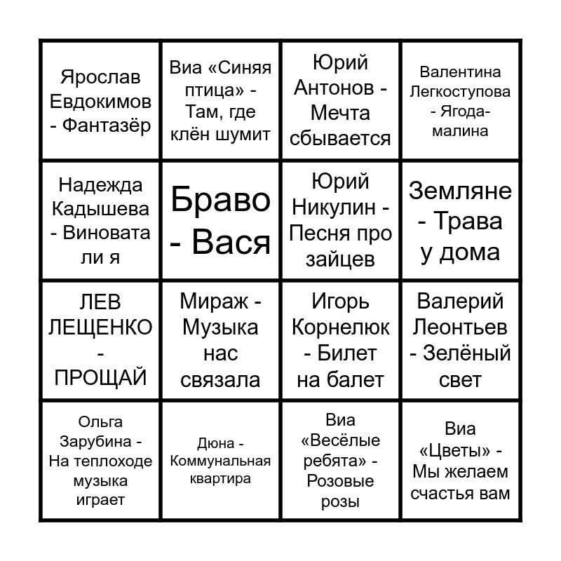 This bingo card has 24 words: Игорь Скляр - Комарово, Виа «Самоцветы» - Всё, что в жизни есть у меня, Земляне - Трава у дома, Ирина Аллегрова - Младший лейтенант, Надежда Кадышева - Виновата ли я, Ярослав Евдокимов - Фантазёр, Браво - Вася, Виа «Синяя птица» - Там, где клён шумит, Дюна - Коммунальная квартира, ЭДУАРД ХИЛЬ - ТРОЛОЛО, ЛЕВ ЛЕЩЕНКО - ПРОЩАЙ, Игорь Корнелюк - Билет на балет, КОМБИНАЦИЯ - БУХГАЛТЕР, Эдита Пьеха - Наш сосед, Юрий Никулин - Песня про зайцев, Андрей Миронов - Бабочка, Виа «Весёлые ребята» - Розовые розы, Юрий Антонов - Мечта сбывается, Мираж - Музыка нас связала, Валерий Леонтьев - Зелёный свет, Ольга Зарубина - На теплоходе музыка играет, Виа «Цветы» - Мы желаем счастья вам, Валентина Легкоступова - Ягода-малина and Муслим Магомаев - Свадьба.