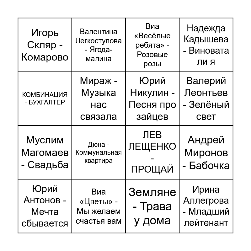This bingo card has 24 words: Эдита Пьеха - Наш сосед, Виа «Синяя птица» - Там, где клён шумит, Валерий Леонтьев - Зелёный свет, Виа «Самоцветы» - Всё, что в жизни есть у меня, КОМБИНАЦИЯ - БУХГАЛТЕР, Игорь Скляр - Комарово, Мираж - Музыка нас связала, Валентина Легкоступова - Ягода-малина, Виа «Цветы» - Мы желаем счастья вам, Ярослав Евдокимов - Фантазёр, Муслим Магомаев - Свадьба, ЛЕВ ЛЕЩЕНКО - ПРОЩАЙ, Браво - Вася, ЭДУАРД ХИЛЬ - ТРОЛОЛО, Юрий Никулин - Песня про зайцев, Игорь Корнелюк - Билет на балет, Земляне - Трава у дома, Виа «Весёлые ребята» - Розовые розы, Дюна - Коммунальная квартира, Андрей Миронов - Бабочка, Юрий Антонов - Мечта сбывается, Ирина Аллегрова - Младший лейтенант, Надежда Кадышева - Виновата ли я and Ольга Зарубина - На теплоходе музыка играет.