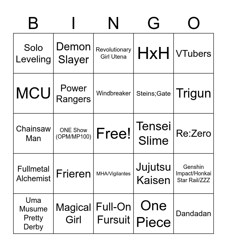 This bingo card has a free space and 24 words: Frieren, Magical Girl, Windbreaker, Uma Musume Pretty Derby, VTubers, Solo Leveling, MCU, Demon Slayer, Tensei Slime, MHA/Vigilantes, Steins;Gate, Chainsaw Man, Jujutsu Kaisen, Genshin Impact/Honkai Star Rail/ZZZ, Power Rangers, One Piece, Re:Zero, Revolutionary Girl Utena, Trigun, ONE Show (OPM/MP100), Dandadan, Fullmetal Alchemist, HxH and Full-On Fursuit.