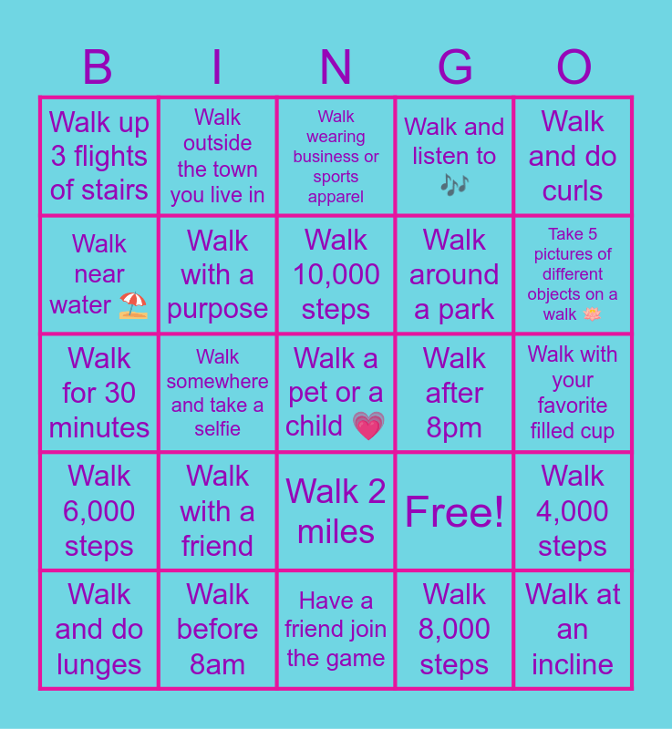 This bingo card has 25 words: Walk with a friend, Have a friend join the game, Walk 10,000 steps, Walk and do lunges, Walk and do curls, Walk up 3 flights of stairs, Walk near water ⛱️, Walk outside the town you live in, Walk after 8pm, Walk 2 miles, Walk around a park, Walk for 30 minutes, Free!, Walk 4,000 steps, Walk with a purpose, Walk at an incline, Walk with your favorite filled cup, Walk wearing business or sports apparel, Take 5 pictures of different objects on a walk 🪷, Walk somewhere and take a selfie, Walk a pet or a child 💗, Walk before 8am, Walk 6,000 steps, Walk and listen to 🎶 and Walk 8,000 steps.
