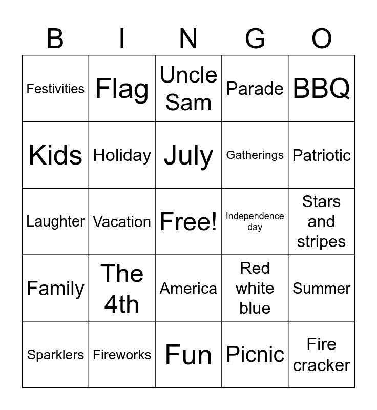This bingo card has a free space and 24 words: The 4th, Fireworks, July, Sparklers, BBQ, Festivities, Kids, Flag, Independence day, America, Gatherings, Laughter, Red white blue, Summer, Holiday, Picnic, Stars and stripes, Uncle Sam, Patriotic, Vacation, Fire cracker, Family, Parade and Fun.