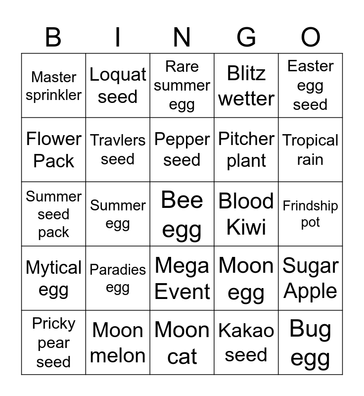 This bingo card has a free space and 28 words: Moon mango, Moon melon, Pepper seed, Kakao seed, Easter egg seed, Master sprinkler, Travlers seed, Moon cat, Blood Kiwi, Sugar Apple, Summer seed pack, Summer egg, Moon egg, Bug egg, Flower Pack, Night seed Pack, Mega Event, Blitz wetter, Tropical rain, Pricky pear seed, Loquat seed, Feijoa seed, Pitcher plant, Frindship pot, Mytical egg, Paradies egg, Rare summer egg and Ein pet ziehen das mehr als 2 kg.