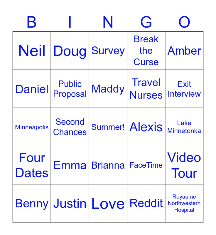This bingo card has a free space and 24 words: Emma, Justin, Maddy, Benny, Amber, Neil, Daniel, Doug, Alexis, Brianna, Travel Nurses, Minneapolis, FaceTime, Video Tour, Public Proposal, Reddit, Lake Minnetonka, Survey, Exit Interview, Second Chances, Royaume Northwestern Hospital, Four Dates, Break the Curse and Love.