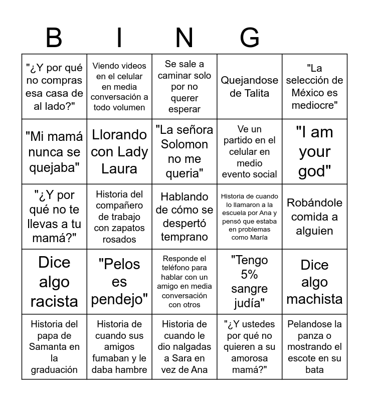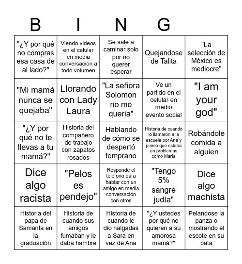 This bingo card has 25 words: "Pelos es pendejo", Historia de cuando le dio nalgadas a Sara en vez de Ana, "La señora Solomon no me queria", Historia del papa de Samanta en la graduación, "La selección de México es mediocre", "¿Y por qué no compras esa casa de al lado?", "Mi mamá nunca se quejaba", Viendo videos en el celular en media conversación a todo volumen, Historia de cuando lo llamaron a la escuela por Ana y pensó que estaba en problemas como María, Responde el teléfono para hablar con un amigo en media conversación con otros, Ve un partido en el celular en medio evento social, "¿Y por qué no te llevas a tu mamá?", "Tengo 5% sangre judía", Dice algo machista, Llorando con Lady Laura, Pelandose la panza o mostrando el escote en su bata, Robándole comida a alguien, Se sale a caminar solo por no querer esperar, "I am your god", Historia del compañero de trabajo con zapatos rosados, Hablando de cómo se despertó temprano, Historia de cuando sus amigos fumaban y le daba hambre, Dice algo racista, Quejandose de Talita and "¿Y ustedes por qué no quieren a su amorosa mamá?".