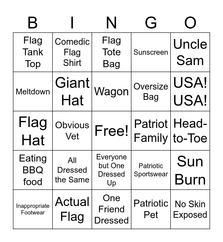 This bingo card has a free space and 30 words: Actual Flag, Kid Flag T-Shirt, Obvious Vet, Flag as Something Else, Flag Tank Top, Flag Tote Bag, Giant Hat, Everyone but One Dressed Up, Patriot Family, One Friend Dressed, Head-to-Toe, No Skin Exposed, Patriotic Pet, Black Outfit, USA! USA!, Old Campaign Gear, Patriotic Sportswear, Eating BBQ food, All Dressed the Same, Uncle Sam, Flag Hat, That looks uncomfortable', Comedic Flag Shirt, Oversize Bag, Meltdown, Sunscreen, Sun Burn, Inappropriate Footwear, Wagon and Umbrella.