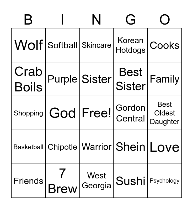 This bingo card has a free space and 24 words: Friends, Chipotle, Sister, Sushi, Cooks, Wolf, Softball, Skincare, Gordon Central, Best Oldest Daughter, Shopping, Purple, Shein, Love, Crab Boils, 7 Brew, West Georgia, Korean Hotdogs, Family, Basketball, God, Warrior, Best Sister and Psychology.