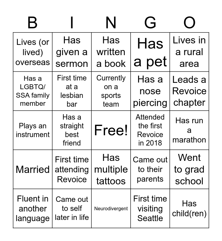 This bingo card has a free space and 24 words: First time attending Revoice, Came out to self later in life, Currently on a sports team, Fluent in another language, Lives in a rural area, Lives (or lived) overseas, Has a LGBTQ/ SSA family member, Has given a sermon, Attended the first Revoice in 2018, Has multiple tattoos, Has a nose piercing, Plays an instrument, Came out to their parents, Went to grad school, First time at a lesbian bar, First time visiting Seattle, Has run a marathon, Has written a book, Leads a Revoice chapter, Has a straight best friend, Has child(ren), Married, Has a pet and Neurodivergent.