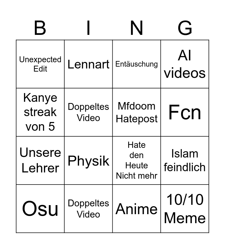 This bingo card has 18 words: Physik, 10/10 Meme, Entäuschung, Unexpected Edit, Hate den Heute Nicht mehr, AI videos, Osu, Lennart, Fcn, Unsere Lehrer, Anime, Kanye streak von 5, Islam feindlich, Doppeltes Video, Mfdoom Hatepost, Valorant, Doppeltes Video and Osu.