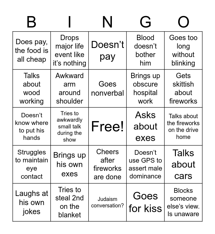 This bingo card has a free space and 28 words: Talks about cars, Stares like a murderer into the distance, Brings up obscure hospital work, Goes for kiss, Talks about wood working, Doesn’t pay, Drops major life event like it’s nothing, Struggles to maintain eye contact, Asks about exes, Laughs at his own jokes, Doesn’t know where to put his hands, Blood doesn’t bother him, Tries to steal 2nd on the blanket, Judaism conversation?, Gets skittish about fireworks, Just drives around randolph, Brings up his own exes, Awkward arm around shoulder, Goes nonverbal, Cheers after fireworks are done, Does pay, the food is all cheap, Goes for hand holding, Blocks someone else’s view. Is unaware, Tries to awkwardly small talk during the show, Talks about the fireworks on the drive home, Doesn’t use GPS to assert male dominance, Goes too long without blinking and Blinks too much.