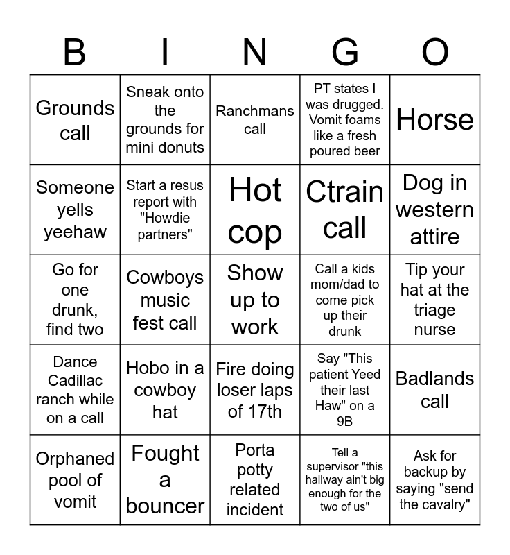 This bingo card has a free space and 24 words: Hobo in a cowboy hat, Fought a bouncer, Hot cop, Orphaned pool of vomit, Horse, Grounds call, Someone yells yeehaw, Sneak onto the grounds for mini donuts, Call a kids mom/dad to come pick up their drunk, Fire doing loser laps of 17th, Ctrain call, Go for one drunk, find two, Say "This patient Yeed their last Haw" on a 9B, Badlands call, Start a resus report with "Howdie partners", Tell a supervisor "this hallway ain't big enough for the two of us", Tip your hat at the triage nurse, Ranchmans call, Dog in western attire, Cowboys music fest call, Ask for backup by saying "send the cavalry", Dance Cadillac ranch while on a call, PT states I was drugged. Vomit foams like a fresh poured beer and Porta potty related incident.