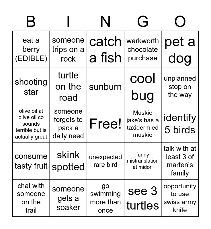 This bingo card has a free space and 24 words: skink spotted, someone gets a soaker, sunburn, chat with someone on the trail, pet a dog, eat a berry (EDIBLE), shooting star, someone trips on a rock, Muskie jake’s has a taxidermied muskie, unexpected rare bird, cool bug, olive oil at olive oil co sounds terrible but is actually great, funny mistranslation at midori, talk with at least 3 of marten's family, turtle on the road, see 3 turtles, identify 5 birds, catch a fish, unplanned stop on the way, someone forgets to pack a daily need, opportunity to use swiss army knife, consume tasty fruit, warkworth chocolate purchase and go swimming more than once.