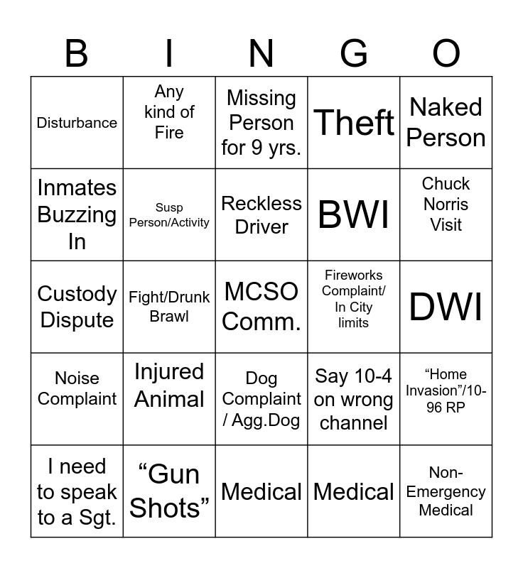 This bingo card has a free space and 24 words: Injured Animal, “Gun Shots”, Reckless Driver, I need to speak to a Sgt., Naked Person, Disturbance, Inmates Buzzing In, Any kind of Fire, Fireworks Complaint/ In City limits, Dog Complaint / Agg.Dog, BWI, Custody Dispute, Say 10-4 on wrong channel, “Home Invasion”/10-96 RP, Susp Person/Activity, Medical, DWI, Missing Person for 9 yrs., Chuck Norris Visit, Fight/Drunk Brawl, Non-Emergency Medical, Noise Complaint, Theft and Medical.