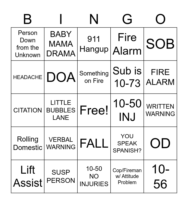 This bingo card has a free space and 60 words: "JUST SEND EM", SUSP PERSON, KARMEN NAPS, Rolling Domestic, Cop/Fireman w/ Attitude Problem, Irate Caller, DOA, 10-60 Vehicle, Sub is 10-73, Traffic Stop, Fire Alarm, SHOPLIFTING @ WAKMART, HEADACHE, DEBRIS IN ROADWAY, 10-50, Person Down from the Unknown, 10-56, SOB, 10-43, Something on Fire, 10-50 INJ, 911 Hangup, Lift Assist, OD, INDECENT EXPOSURE, DOMESTIC, MA'AM MA'AM MA'AM, MY BABY DADDY, FIRE ALARM, RETONE, VEH FIRE, SUICIDAL SUBJECT, PHYSICAL DISTURBANCE, ABANDONED CHILD, BABY MAMA DRAMA, CHOKING, STEVE COMPLAINT, LITTLE BUBBLES LANE, SHOTS FIRED, CITATION, REPORT ON FILE, VERBAL WARNING, WRITTEN WARNING, 10-61 @ O'REILLYS, YOU SPEAK SPANISH?, MAGISTRATE DOESN'T ANSWER, NOISE COMPLAINT, STRUCTURE FIRE, SERVE PAPERS, FALL, 10-50 NO INJURIES, COW, HORSE, ANIMAL COMPLAINT, BITE, IT'S NOT AN EMERGENCY, 10-40, LARCENY, Phone troubles and Subject with a gun.