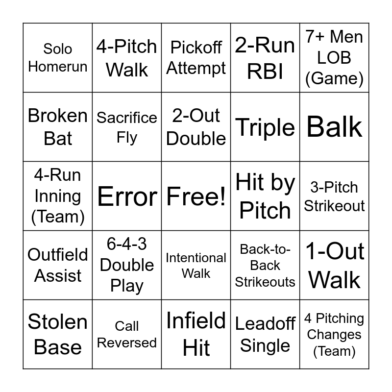 This bingo card has a free space and 24 words: 6-4-3 Double Play, Call Reversed, 2-Out Double, Stolen Base, 7+ Men LOB (Game), Solo Homerun, Broken Bat, 4-Pitch Walk, Hit by Pitch, Intentional Walk, Triple, 4-Run Inning (Team), Back-to-Back Strikeouts, 1-Out Walk, Sacrifice Fly, Leadoff Single, 3-Pitch Strikeout, Pickoff Attempt, Balk, Error, 4 Pitching Changes (Team), Outfield Assist, 2-Run RBI and Infield Hit.