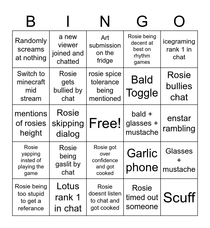 This bingo card has a free space and 24 words: Rosie being gaslit by chat, Lotus rank 1 in chat, rosie spice tolerance being mentioned, Rosie being too stupid to get a referance, icegraming rank 1 in chat, Randomly screams at nothing, Switch to minecraft mid stream, a new viewer joined and chatted, bald + glasses + mustache, Rosie got over confidence and got cooked, Bald Toggle, mentions of rosies height, Garlic phone, Glasses + mustache, Rosie gets bullied by chat, Rosie timed out someone, enstar rambling, Art submission on the fridge, Rosie bullies chat, Rosie skipping dialog, Scuff, Rosie yapping insted of playing the game, Rosie being decent at best on rhythm games and Rosie doesnt listen to chat and got cooked.