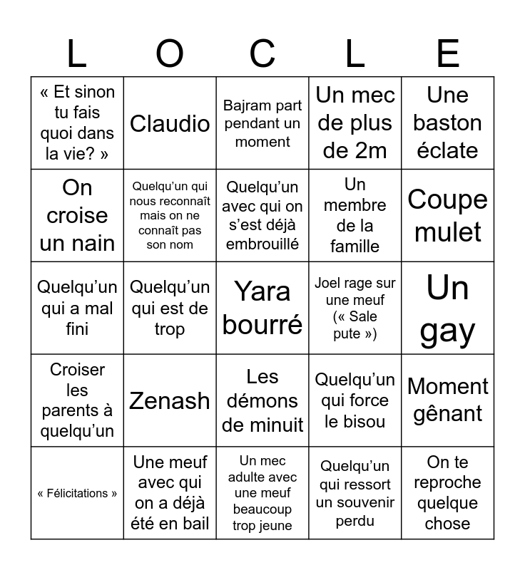 This bingo card has a free space and 24 words: Zenash, Une meuf avec qui on a déjà été en bail, Quelqu’un avec qui on s’est déjà embrouillé, « Félicitations », Une baston éclate, « Et sinon tu fais quoi dans la vie? », On croise un nain, Claudio, Joel rage sur une meuf (« Sale pute »), Les démons de minuit, Un membre de la famille, Quelqu’un qui a mal fini, Quelqu’un qui force le bisou, Moment gênant, Quelqu’un qui nous reconnaît mais on ne connaît pas son nom, Quelqu’un qui ressort un souvenir perdu, Un gay, Bajram part pendant un moment, Coupe mulet, Quelqu’un qui est de trop, On te reproche quelque chose, Croiser les parents à quelqu’un, Un mec de plus de 2m and Un mec adulte avec une meuf beaucoup trop jeune.