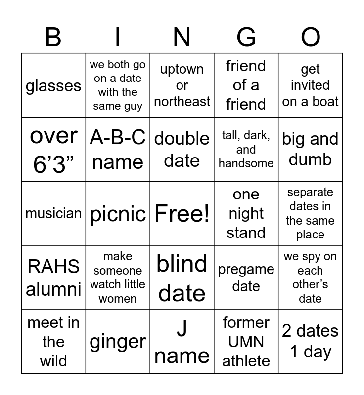 This bingo card has a free space and 24 words: make someone watch little women, ginger, double date, meet in the wild, get invited on a boat, glasses, over 6’3”, we both go on a date with the same guy, one night stand, blind date, tall, dark, and handsome, musician, pregame date, we spy on each other’s date, A-B-C name, former UMN athlete, separate dates in the same place, uptown or northeast, big and dumb, picnic, 2 dates 1 day, RAHS alumni, friend of a friend and J name.