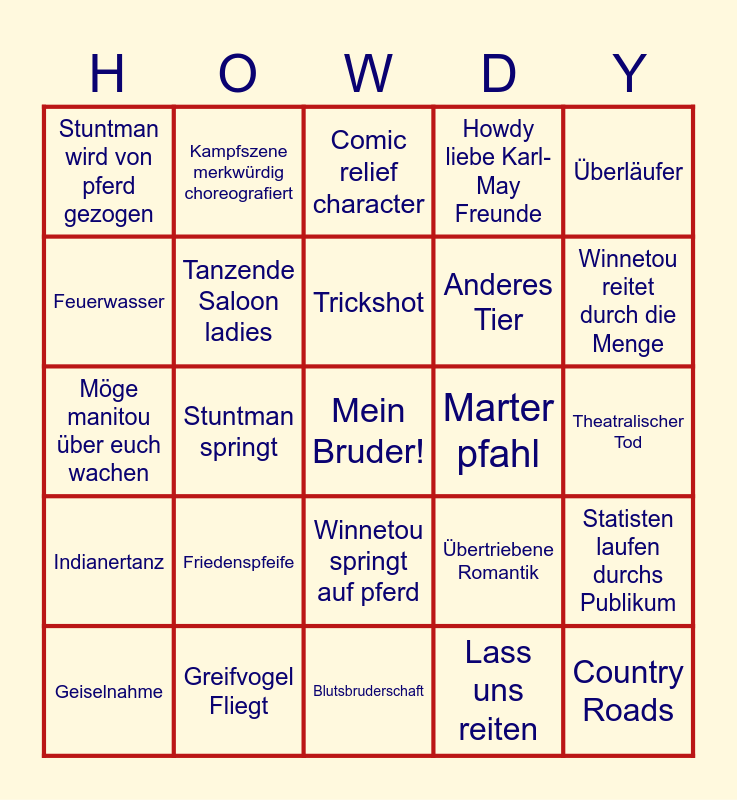 This bingo card has 30 words: Greifvogel Fliegt, Winnetou hält einen Monolog, Stuntman springt, Stuntman brennt, Stuntman wird von pferd gezogen, Comic relief character, Tanzende Saloon ladies, Winnetou springt auf pferd, Marter pfahl, Blutsbruderschaft, Theatralischer Tod, Mein Bruder!, Lass uns reiten, Country Roads, Winnetou reitet durch die Menge, Monolog zum Weltfrieden, Übertriebene Romantik, Indianertanz, Friedenspfeife, Überläufer, Möge manitou über euch wachen, Character auf Kalkberg, Kampfszene merkwürdig choreografiert, Anderes Tier, Feuerwasser, Howdy liebe Karl-May Freunde, Statisten laufen durchs Publikum, Geiselnahme, Trickshot and Bühnenbild wird durch plot beschädigt.