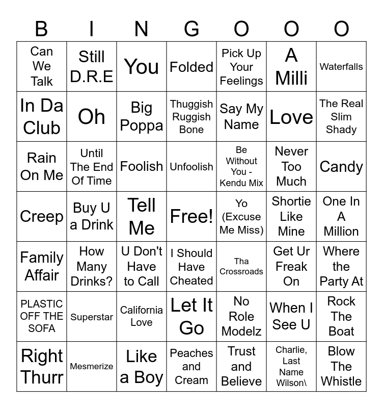 This bingo card has a free space and 48 words: Family Affair, Buy U a Drink, Like a Boy, I Should Have Cheated, Say My Name, Shortie Like Mine, Waterfalls, Right Thurr, Until The End Of Time, Tell Me, Folded, Pick Up Your Feelings, Never Too Much, Candy, Creep, Superstar, You, Unfoolish, No Role Modelz, A Milli, The Real Slim Shady, In Da Club, Still D.R.E, Big Poppa, Trust and Believe, Love, One In A Million, PLASTIC OFF THE SOFA, How Many Drinks?, Foolish, Let It Go, Be Without You - Kendu Mix, When I See U, Rock The Boat, Can We Talk, Mesmerize, U Don't Have to Call, Peaches and Cream, Yo (Excuse Me Miss), Charlie, Last Name Wilson\, Where the Party At, Rain On Me, Oh, California Love, Thuggish Ruggish Bone, Tha Crossroads, Get Ur Freak On and Blow The Whistle.