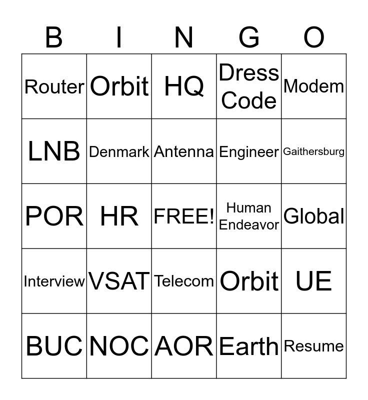 This bingo card has a free space and 24 words: VSAT, NOC, Antenna, BUC, Modem, Router, LNB, Orbit, Human Endeavor, Telecom, Engineer, POR, Orbit, UE, Denmark, Earth, Global, HQ, Gaithersburg, HR, Resume, Interview, Dress Code and AOR.