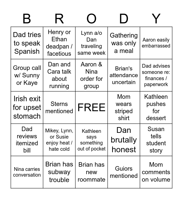 This bingo card has a free space and 26 words: Kathleen says something out of pocket, Guiors mentioned, Aaron & Nina order for group, Brian has subway trouble, Aaron easily embarrassed, Dad tries to speak Spanish, Group call w/ Sunny or Kaye, Henry or Ethan deadpan / facetious, Kathleen pushes for dessert, Dan brutally honest, Brian's attendance uncertain, Irish exit for upset stomach, Susan tells student story, Nina carries conversation, Sterns mentioned, Nina asks for hot sauce, Gathering was only a meal, Dad reviews itemized bill, Lynn a/o Dan traveling same week, Mom comments on volume, Dad advises someone re: finances / paperwork, Brian has new roommate, Mom wears striped shirt, Mikey, Lynn, or Susie enjoy heat / hate cold, Dan and Cara talk about running and Someone has new glasses.