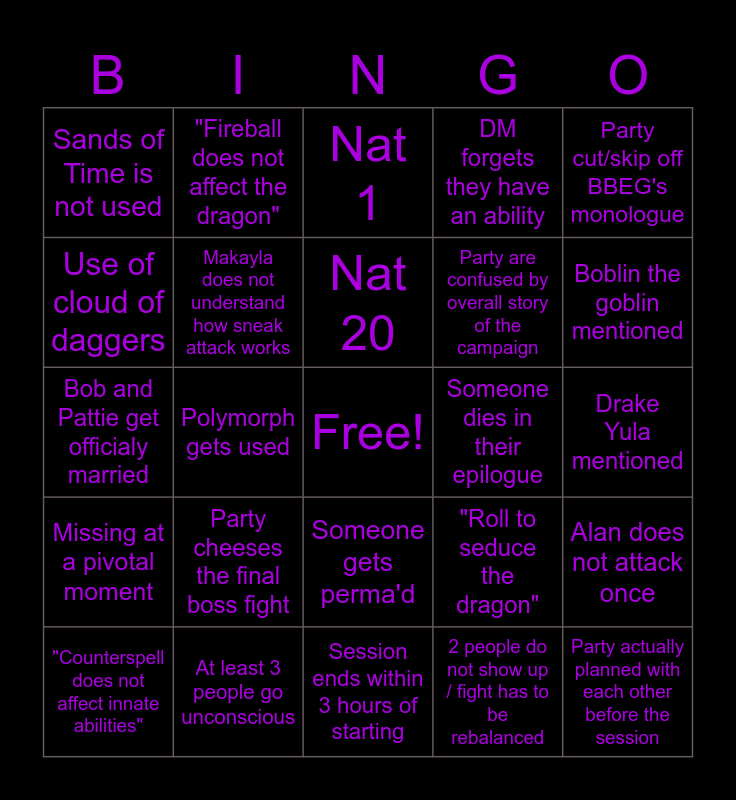 This bingo card has a free space and 24 words: Party cheeses the final boss fight, At least 3 people go unconscious, Nat 20, "Counterspell does not affect innate abilities", Party cut/skip off BBEG's monologue, Sands of Time is not used, Use of cloud of daggers, "Fireball does not affect the dragon", Someone dies in their epilogue, Someone gets perma'd, Party are confused by overall story of the campaign, Bob and Pattie get officialy married, "Roll to seduce the dragon", Alan does not attack once, Makayla does not understand how sneak attack works, 2 people do not show up / fight has to be rebalanced, Drake Yula mentioned, Nat 1, Boblin the goblin mentioned, Polymorph gets used, Party actually planned with each other before the session, Missing at a pivotal moment, DM forgets they have an ability and Session ends within 3 hours of starting.