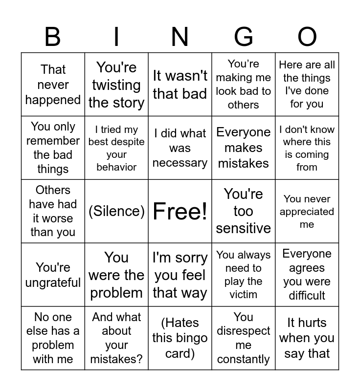 This bingo card has a free space and 24 words: You were the problem, And what about your mistakes?, I did what was necessary, No one else has a problem with me, Here are all the things I've done for you, That never happened, You only remember the bad things, You're twisting the story, You're too sensitive, I'm sorry you feel that way, Everyone makes mistakes, Others have had it worse than you, You always need to play the victim, Everyone agrees you were difficult, I tried my best despite your behavior, You disrespect me constantly, You never appreciated me, It wasn't that bad, I don't know where this is coming from, (Silence), It hurts when you say that, You're ungrateful, You’re making me look bad to others and (Hates this bingo card).