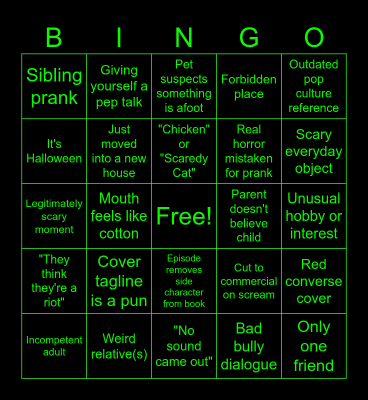 This bingo card has a free space and 31 words: "No sound came out", Arms/legs "felt like Jell-O", Mouth feels like cotton, Pet jumpscare, Sibling prank, Pet suspects something is afoot, Just moved into a new house, Cut to commercial on scream, Parent doesn't believe child, Bad bully dialogue, Unusual hobby or interest, Only one friend, It was just a dream, Antagonist has no clear motivations, Scary everyday object, Twist ending nullifies majority of plot, Red converse cover, Cover tagline is a pun, "They think they're a riot", Episode removes side character from book, Outdated pop culture reference, Chapter cliffhanger was a lie, Incompetent adult, Giving yourself a pep talk, Real horror mistaken for prank, It's Halloween, Forbidden place, Legitimately scary moment, Weird relative(s), "Chicken" or "Scaredy Cat" and Raspy voice.