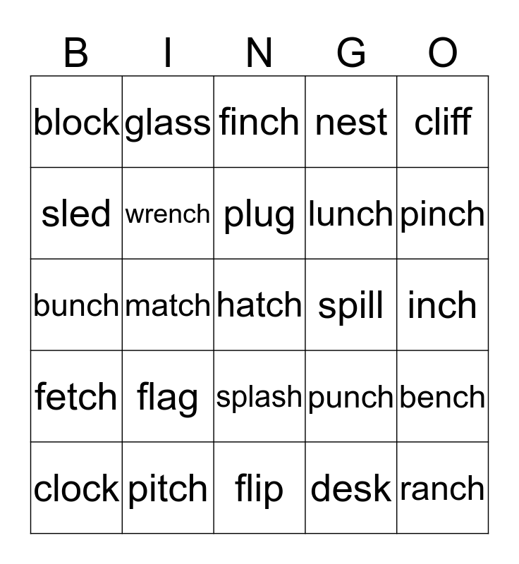 This bingo card has 25 words: flag, flip, plug, clock, cliff, block, sled, glass, spill, splash, lunch, bunch, punch, bench, wrench, ranch, inch, finch, pinch, match, hatch, pitch, fetch, nest and desk.