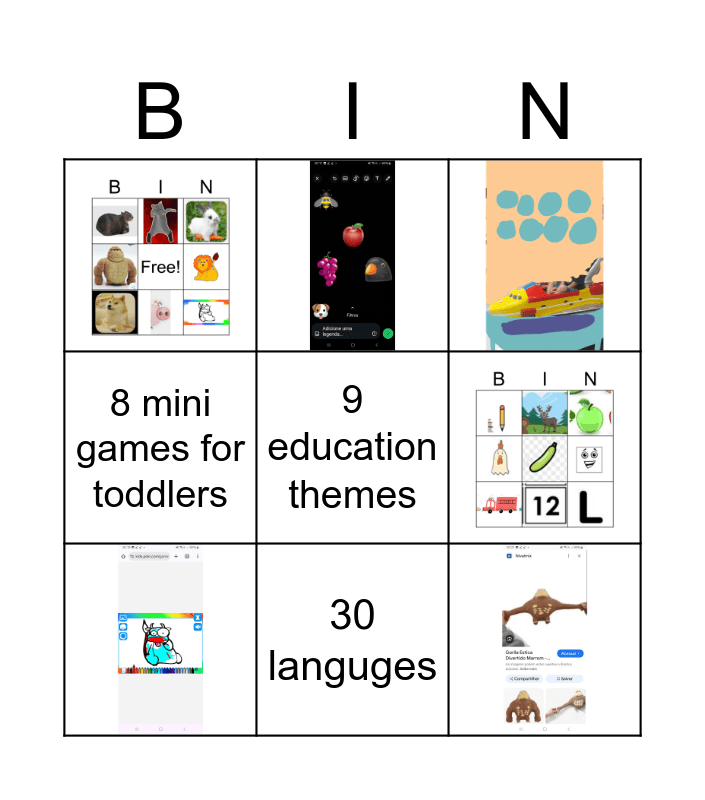 This bingo card has 6 images, a free space and 2 words: 8 mini games for toddlers and 30 languges.