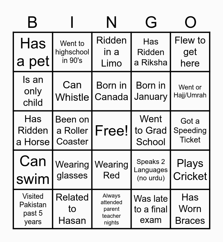 This bingo card has a free space and 24 words: Wearing glasses, Related to Hasan, Born in Canada, Visited Pakistan past 5 years, Flew to get here, Has a pet, Is an only child, Went to highschool in 90's, Went to Grad School, Wearing Red, Born in January, Has Ridden a Horse, Speaks 2 Languages (no urdu), Plays Cricket, Can Whistle, Was late to a final exam, Got a Speeding Ticket, Ridden in a Limo, Went or Hajj/Umrah, Been on a Roller Coaster, Has Worn Braces, Can swim, Has Ridden a Riksha and Always attended parent teacher nights.