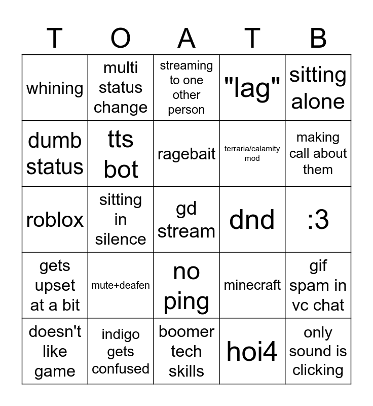 This bingo card has a free space and 24 words: mute+deafen, indigo gets confused, ragebait, doesn't like game, sitting alone, whining, dumb status, multi status change, dnd, no ping, terraria/calamity mod, roblox, minecraft, gif spam in vc chat, tts bot, hoi4, :3, streaming to one other person, making call about them, sitting in silence, only sound is clicking, gets upset at a bit, "lag" and boomer tech skills.