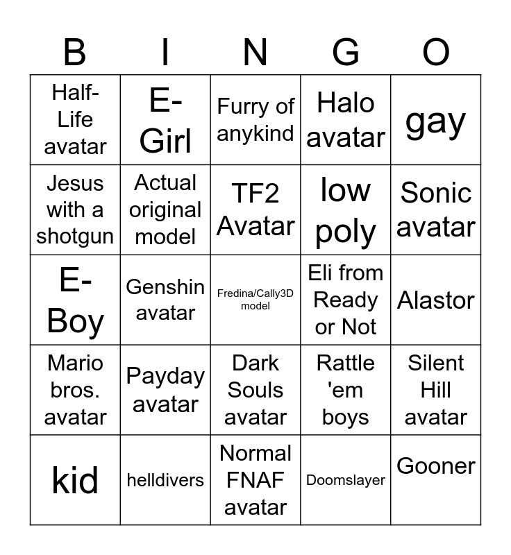 This bingo card has a free space and 24 words: Payday avatar, helldivers, TF2 Avatar, kid, gay, Half-Life avatar, Jesus with a shotgun, E-Girl, Eli from Ready or Not, Dark Souls avatar, low poly, E-Boy, Rattle 'em boys, Silent Hill avatar, Actual original model, Doomslayer, Alastor, Furry of anykind, Sonic avatar, Genshin avatar, Gooner, Mario bros. avatar, Halo avatar and Normal FNAF avatar.