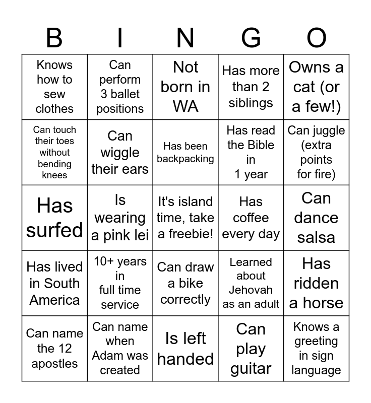 This bingo card has a free space and 29 words: Can name the 12 apostles, Has been to Hawaii, Is wearing a pink lei, Has worked on a theocratic construction project, Knows how to sew clothes, Not born in WA, Can wiggle their ears, 10+ years in full time service, Has coffee every day, Can name when Adam was created, Can dance salsa, Knows a greeting in sign language, Is left handed, Can play guitar, Can juggle (extra points for fire), Has attended a special convention, Can draw a bike correctly, Has lived in South America, Owns a cat (or a few!), Has surfed, Learned about Jehovah as an adult, Has made ice cream, Has read the Bible in 1 year, Can touch their toes without bending knees, Has more than 2 siblings, Can perform 3 ballet positions, Has ridden a horse, Has been backpacking and Is wearing a blue shirt.