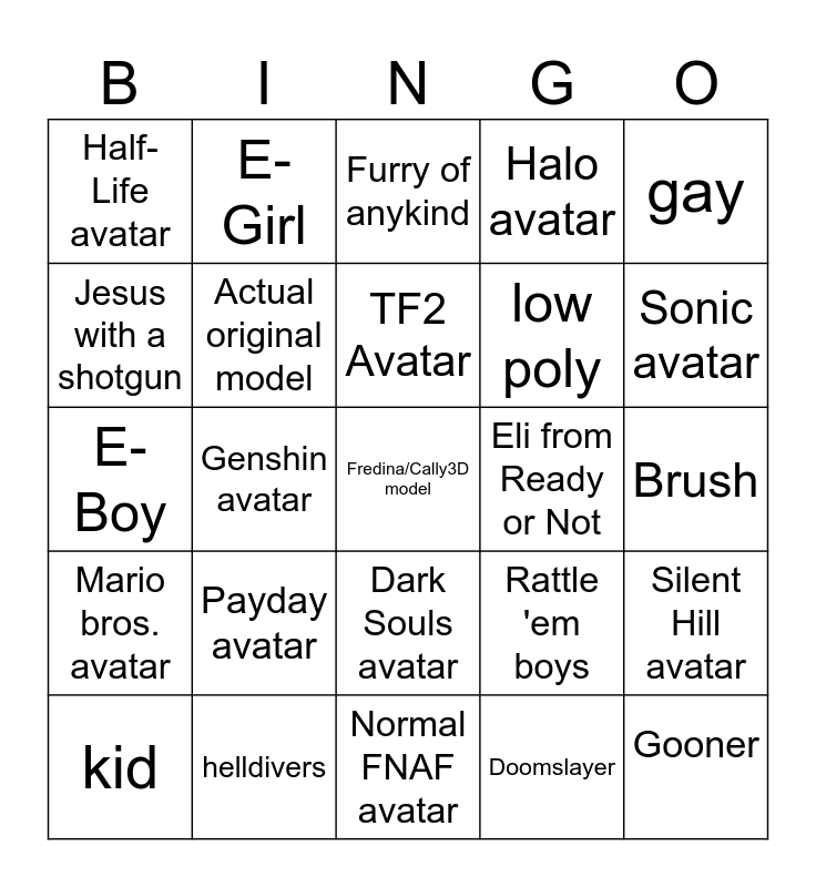 This bingo card has a free space and 24 words: Payday avatar, helldivers, TF2 Avatar, kid, gay, Half-Life avatar, Jesus with a shotgun, E-Girl, Eli from Ready or Not, Dark Souls avatar, low poly, E-Boy, Rattle 'em boys, Silent Hill avatar, Actual original model, Doomslayer, Brush, Furry of anykind, Sonic avatar, Genshin avatar, Gooner, Mario bros. avatar, Halo avatar and Normal FNAF avatar.