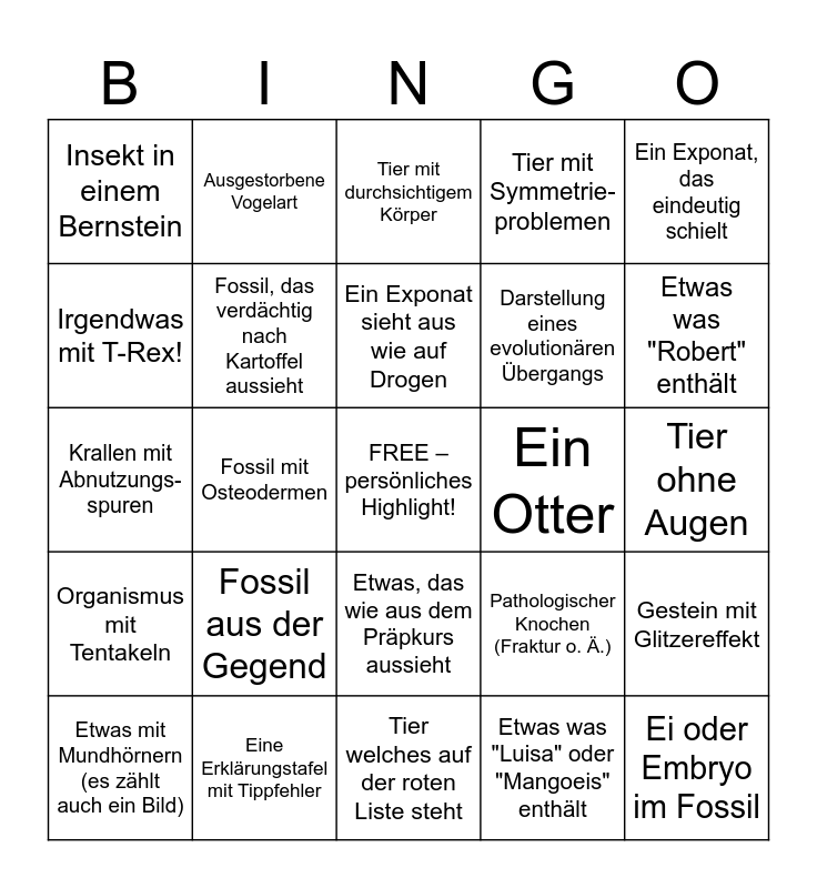 This bingo card has a free space and 24 words: Fossil aus der Gegend, Eine Erklärungstafel mit Tippfehler, Ein Exponat sieht aus wie auf Drogen, Etwas mit Mundhörnern (es zählt auch ein Bild), Ein Exponat, das eindeutig schielt, Insekt in einem Bernstein, Irgendwas mit T-Rex!, Ausgestorbene Vogelart, Ein Otter, Etwas, das wie aus dem Präpkurs aussieht, Darstellung eines evolutionären Übergangs, Krallen mit Abnutzungs-spuren, Pathologischer Knochen (Fraktur o. Ä.), Gestein mit Glitzereffekt, Fossil, das verdächtig nach Kartoffel aussieht, Etwas was "Luisa" oder "Mangoeis" enthält, Tier ohne Augen, Tier mit durchsichtigem Körper, Etwas was "Robert" enthält, Fossil mit Osteodermen, Ei oder Embryo im Fossil, Organismus mit Tentakeln, Tier mit Symmetrie-problemen and Tier welches auf der roten Liste steht.