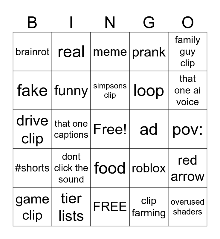 This bingo card has a free space and 24 words: dont click the sound, tier lists, simpsons clip, game clip, family guy clip, brainrot, fake, real, ad, food, loop, drive clip, roblox, red arrow, funny, clip farming, pov:, meme, that one ai voice, that one captions, overused shaders, #shorts, prank and FREE.