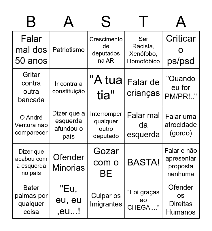 This bingo card has 25 words: Ofender Minorias, Culpar os Imigrantes, "A tua tia", Bater palmas por qualquer coisa, Criticar o ps/psd, Falar mal dos 50 anos, Gritar contra outra bancada, Patriotismo, Falar mal da esquerda, Gozar com o BE, Falar de crianças, O André Ventura não comparecer, BASTA!, Falar e não apresentar proposta nenhuma, Ir contra a constituição, Ofender os Direitas Humanos, Falar uma atrocidade (gordo), Crescimento de deputados na AR, "Quando eu for PM/PR!..", Dizer que a esquerda afundou o país, Interromper qualquer outro deputado, "Eu, eu, eu ,eu...!, Dizer que acabou com a esquerda no país, Ser Racista, Xenófobo, Homofóbico and "Foi graças ao CHEGA....".