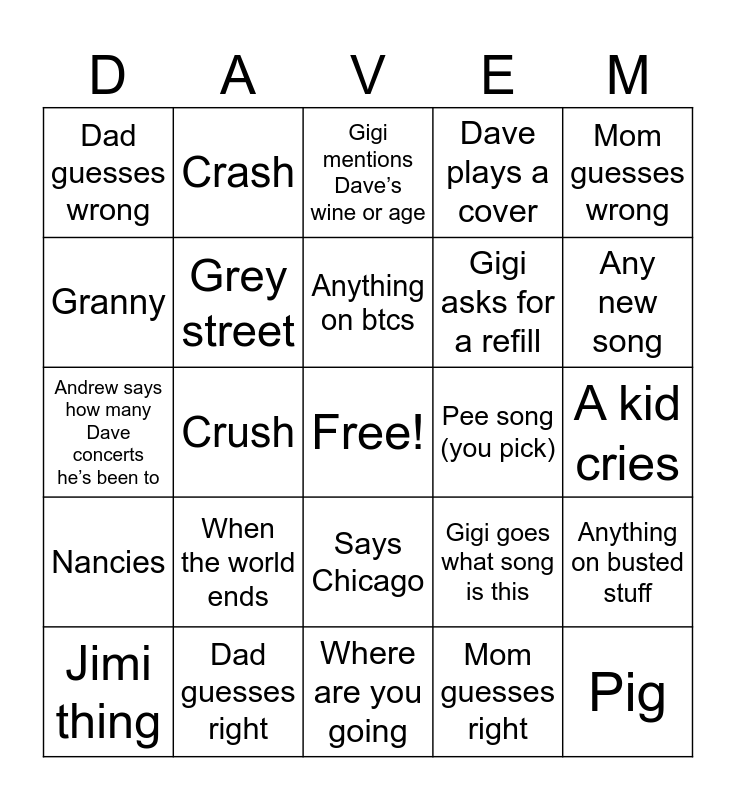 This bingo card has a free space and 29 words: Jimi thing, 41, Crush, Mom it’s my birthday, Dad guesses wrong, Gigi mentions Dave’s wine or age, Grey street, When the world ends, Pee song (you pick), Dad guesses right, A kid cries, Pig, Where are you going, Mom guesses right, Any new song, Gigi asks to turn it up, Says Chicago, Nancies, Mom guesses wrong, Andrew says how many Dave concerts he’s been to, Gigi goes what song is this, Ants, Gigi asks for a refill, Granny, Dave plays a cover, Crash, Anything on busted stuff, Anything on btcs and Anything on stand up.