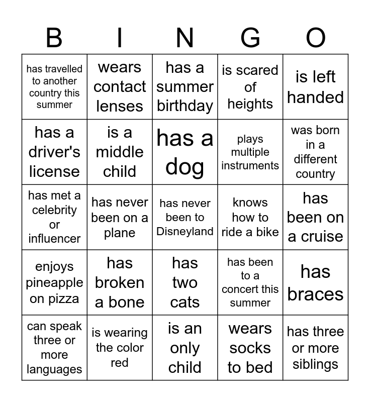 This bingo card has 25 words: has broken a bone, is an only child, has a dog, can speak three or more languages, is left handed, has travelled to another country this summer, has a driver's license, wears contact lenses, knows how to ride a bike, has two cats, plays multiple instruments, has met a celebrity or influencer, has been to a concert this summer, has braces, is a middle child, has three or more siblings, has been on a cruise, has a summer birthday, was born in a different country, has never been on a plane, has never been to Disneyland, is wearing the color red, enjoys pineapple on pizza, is scared of heights and wears socks to bed.